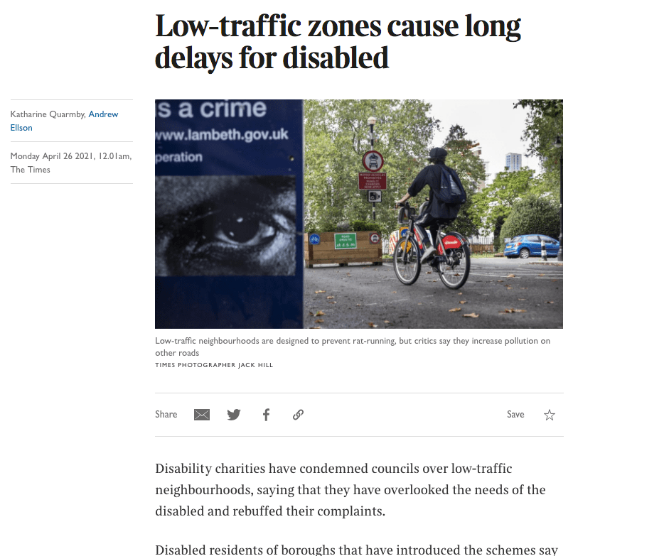 I wrote the piece above with Andrew Ellson of the Times, which you can read here, looking at the effect of the hasty implementation of Low Traffic Neighbourhoods (LTNs) on disabled Londoners.